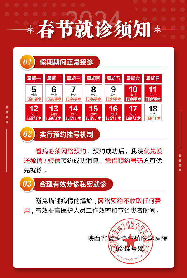 陕西省老医协生殖医学医院为方便广大患者春节假期就诊发布春节就诊须知: