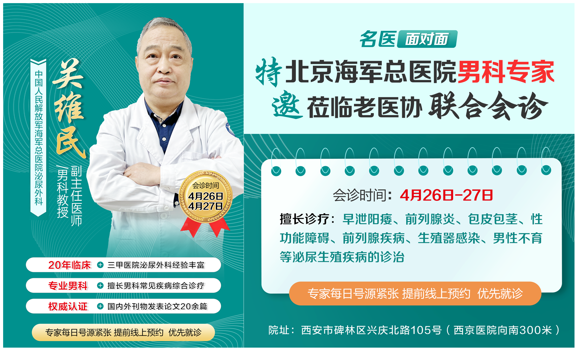北京海军总医院泌尿科领域的权威专家——关维民教授,将于4月26日与27日亲临本院,为广大患者提供男科疑难杂症的会诊服务。